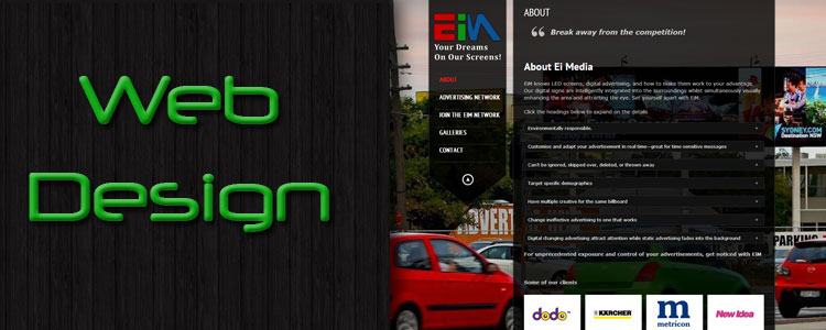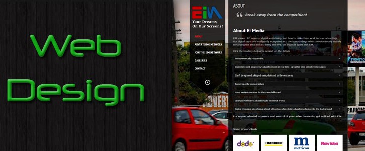 Designed the entire branding for Ei Media including logo, letterheads and business card designs. Website was also created to client specifications as a full screen image site, showing off their beautiful screens and event pictures. Advertising and Ad Designs for their massive 30m² Digital Billboard is also done by myself.
